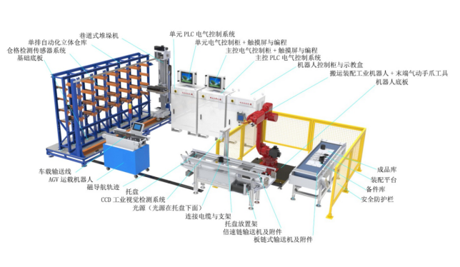 該設(shè)備由工業(yè)機器人、AGV小車、托盤流水線、裝配流水線、視覺系統(tǒng)和碼垛機立體倉庫等六大系統(tǒng)組成。