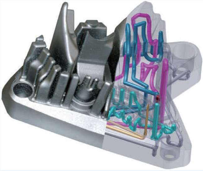 鐵基合金是3D 打印金屬材料中研究較早、較深入的一類合金,較常用的鐵基合金有工具鋼、316L 不銹鋼、M2 高速鋼、H13 模具鋼和15-5PH 馬氏體時(shí)效鋼等。鐵基合金使用成本較低、硬度高、韌性好,同時(shí)具有良好的機(jī)械加工性,特別適合于模具制造。3D打印隨形水道模具是鐵基合金的一大應(yīng)用,傳統(tǒng)工藝異形水道難以加工,而3D打印可以控制冷卻流道的布置與型腔的幾何形狀基本一致(圖2),能提升溫度場的均勻性,有效降低產(chǎn)品缺陷并提高模具壽命。