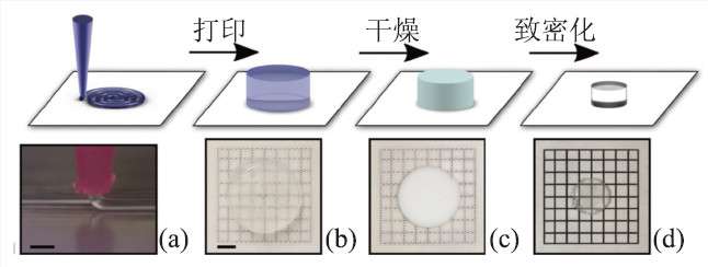 DIW 使用的耗材為適合于擠出的陶瓷膏體,多用于羥基磷灰石、磷酸鈣、生物玻璃等生物陶瓷的組織工程支架制造。將經(jīng)過親水處理的納米石英粉末、四乙二醇二甲醚和PDMS混合制得適合打印的陶瓷墨水,通過DIW 打印、干燥和燒結(jié)后,可制造出高透明度的石英玻璃(圖6)。