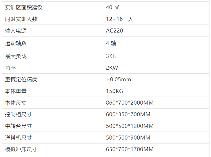 四軸轉(zhuǎn)臂式工業(yè)機器人本體(含控制柜) 3個、模擬沖床2個、送料機2個、中轉(zhuǎn)臺1個。