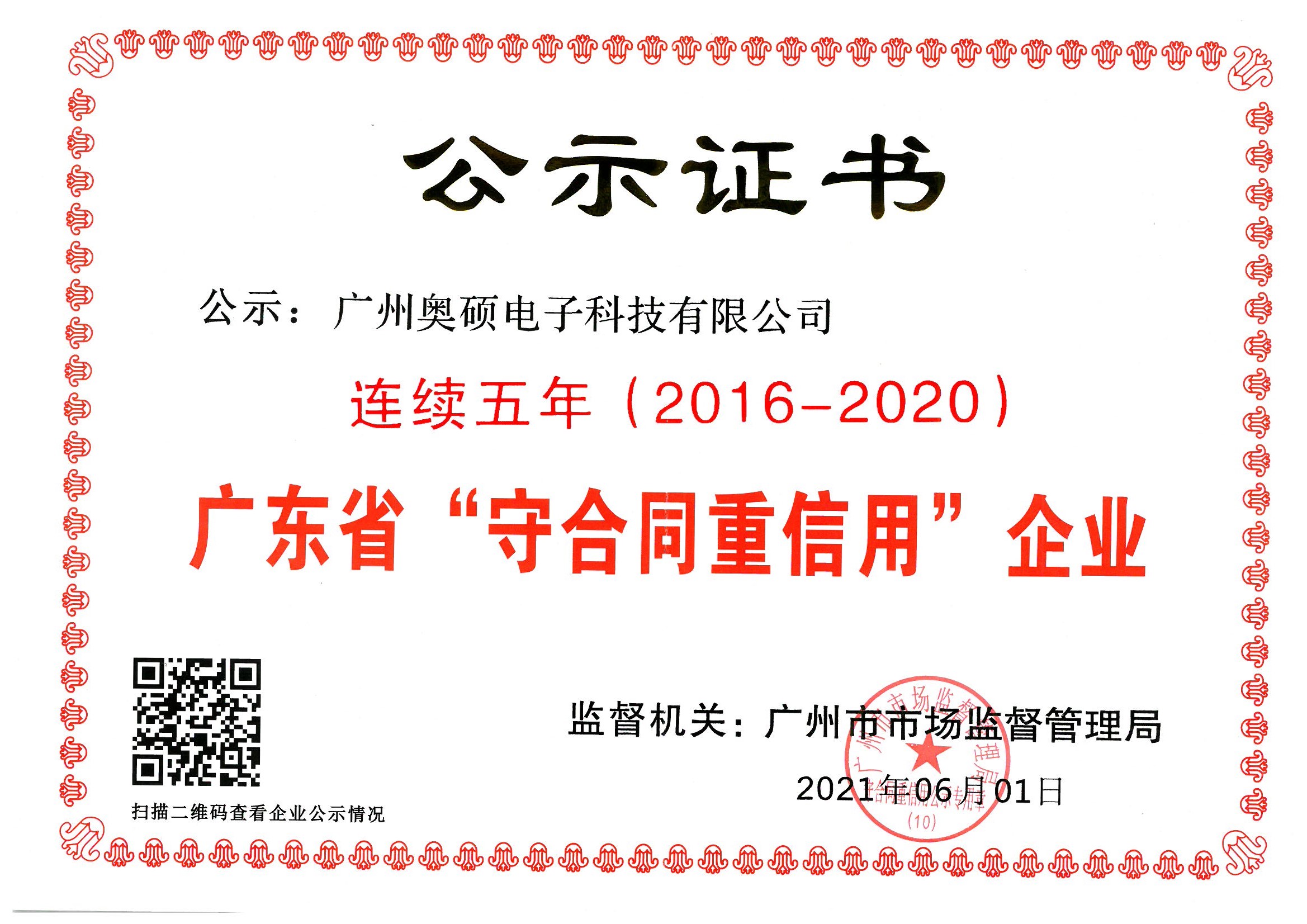 祝賀廣州奧碩電子科技有限公司連續(xù)五年獲“守合同重信用”榮譽(yù)證書