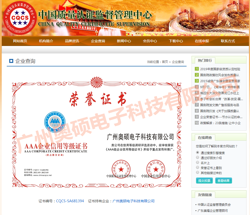 2021年3月,廣州奧碩電子科技有限公司經(jīng)中國(guó)質(zhì)量認(rèn)證監(jiān)督管理中心(CHINA QUALITY CERTIFICATE SUPERVISION)審評(píng),獲得AAA企業(yè)信用等級(jí)證書(shū)。